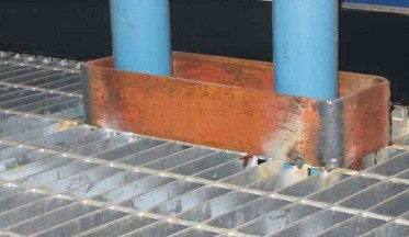 切割后的钢格板内环焊扁钢,加固格栅板,确保其强度,保持整体工艺美观。钢格板的开孔边缘的扁钢高度应统一一致,且下部与格栅下部平齐。钢格板开孔的边缘扁钢接头处的焊接应圆滑美观,扁钢高度应一致,和钢格板应垂直。在安装完工后,对铁锈、残留焊接飞溅物和影响油漆质量的杂物应予清除。